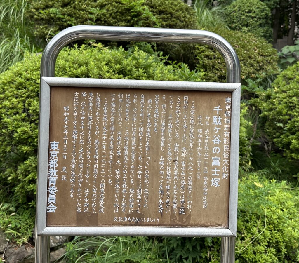 冨士塚とは江戸時代に富士山に行くことが難しい人達のために作られた富士山を模した塚です。江戸時代中期多くの冨士塚が作られましたが、当社の冨士塚もその一つで、寛政元年(1789年)の築造とされており都内に現存する富士塚の中では最古とされている。大正12年(1923年)の関東大震災後に修復されているもののの、旧態をよくとどめ江戸中期以降、江戸市中を中心に広く庶民の間で信仰されていた冨士信仰の在り方を理解する上で貴重な遺構である。